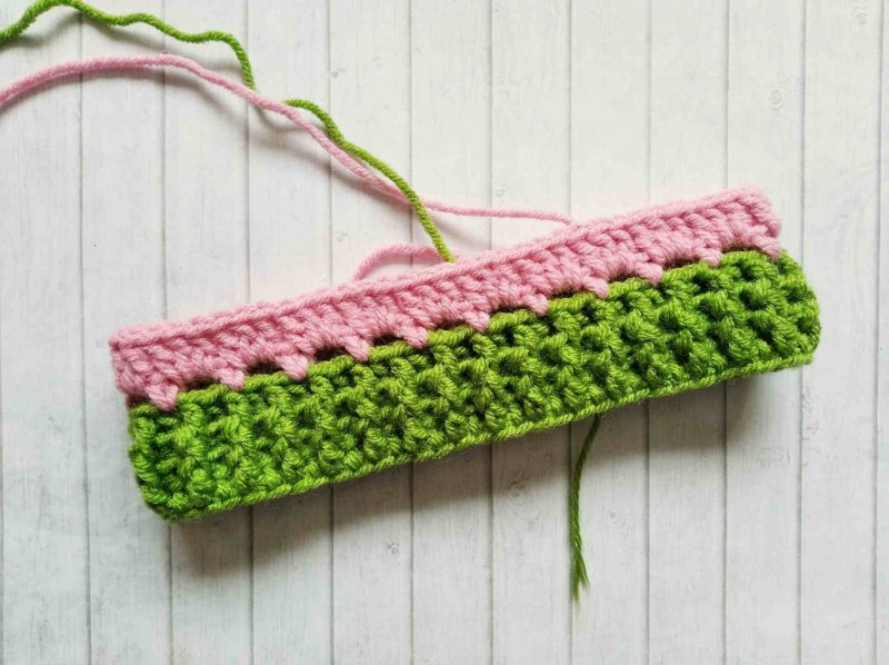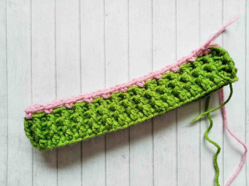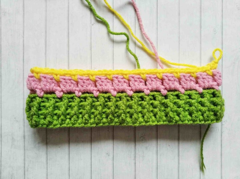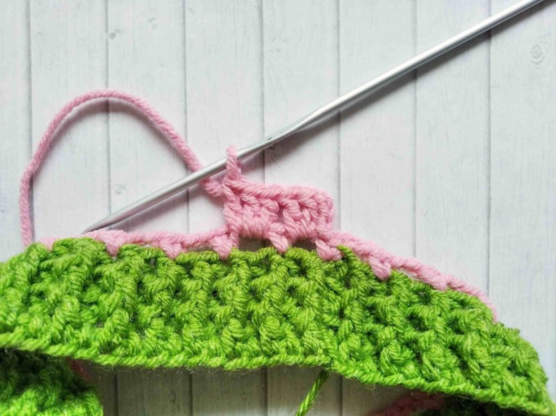 Берем пряжу другого цвета и провязываем в петельку 1 столбик без накида. А затем делаем 2 воздушных петли и снизу пропускаем 2 петельки. Вновь вяжем столбик без накида и делаем 2 воздушных. Так вяжем до конца ряда.