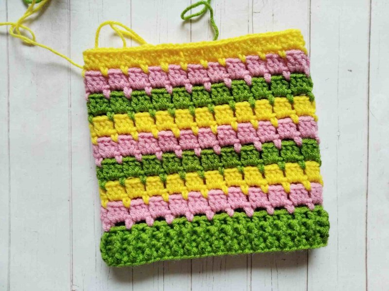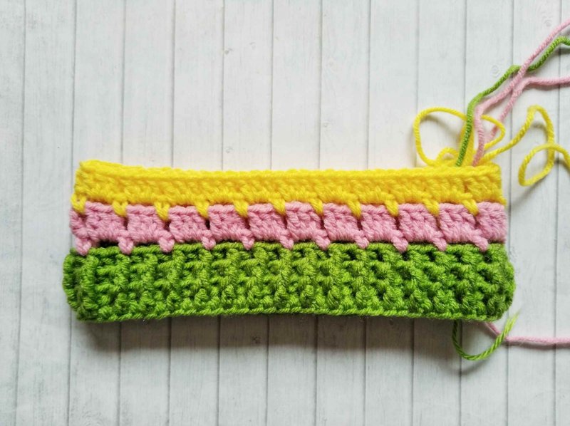 Вяжем новый ряд нитью другого цвета Провязываем между 2 элементами из 3 столбиков с накидом 1 столбик без накида. Делаем 2 воздушных петли и пропускаем 3 столбика с накидом. Вяжем далее 1 столбик без накида. И так вяжем до конца ряда.