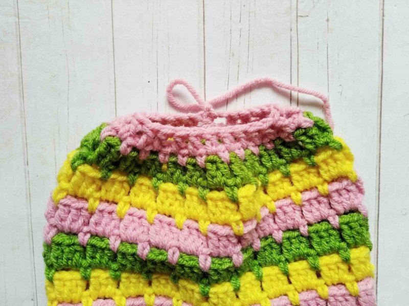 Оставшиеся петли просто собираем на нитку и стягиваем. Закрепляем нить узелком и лишнее обрезаем.