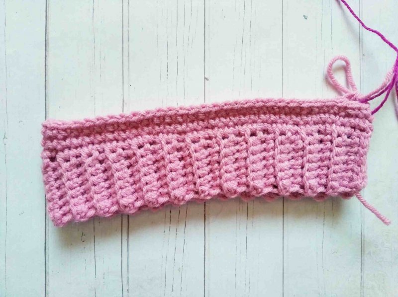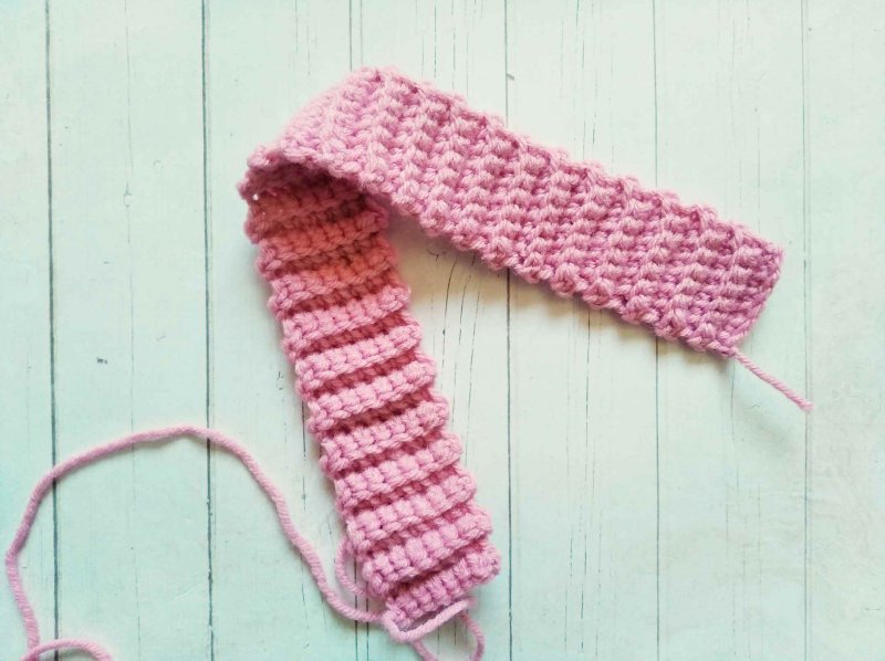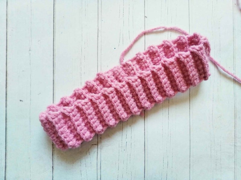 Набираем цепочку из петелек. Количество зависит от желаемой высоты резинки. И вяжем далее несколько рядов С/Б/Н. Пока резинка не будет равна объему головы. Лучше всего примерять резинку к голове в процессе вязания или заранее измерить голову ребенка.