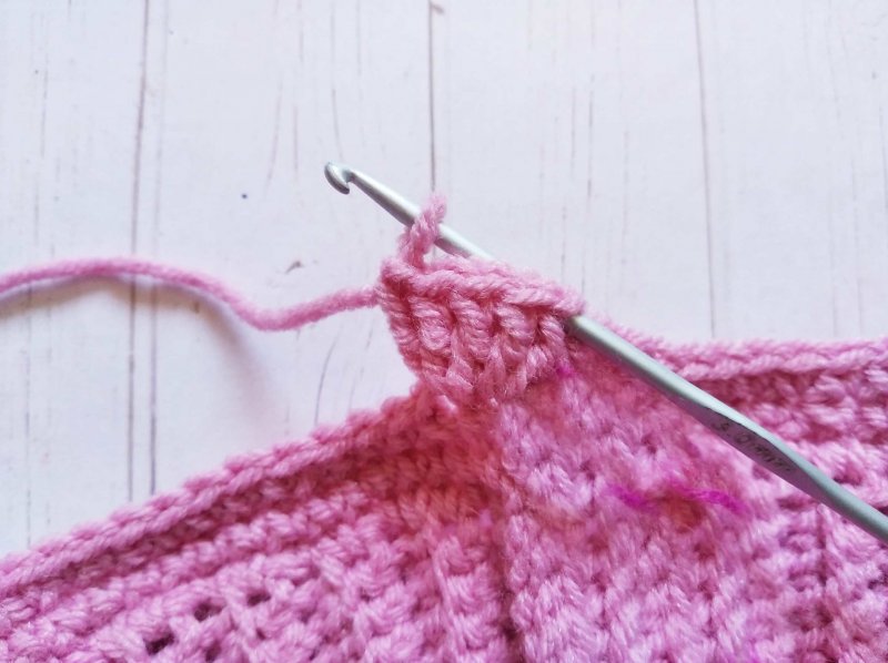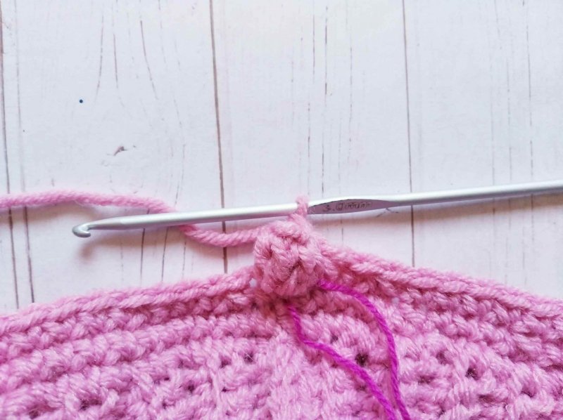 Теперь будем вязать ряд с шишечками. Провязываем 11 С/Б/Н. И в 12 петлю вяжем 5 С/С/Н.