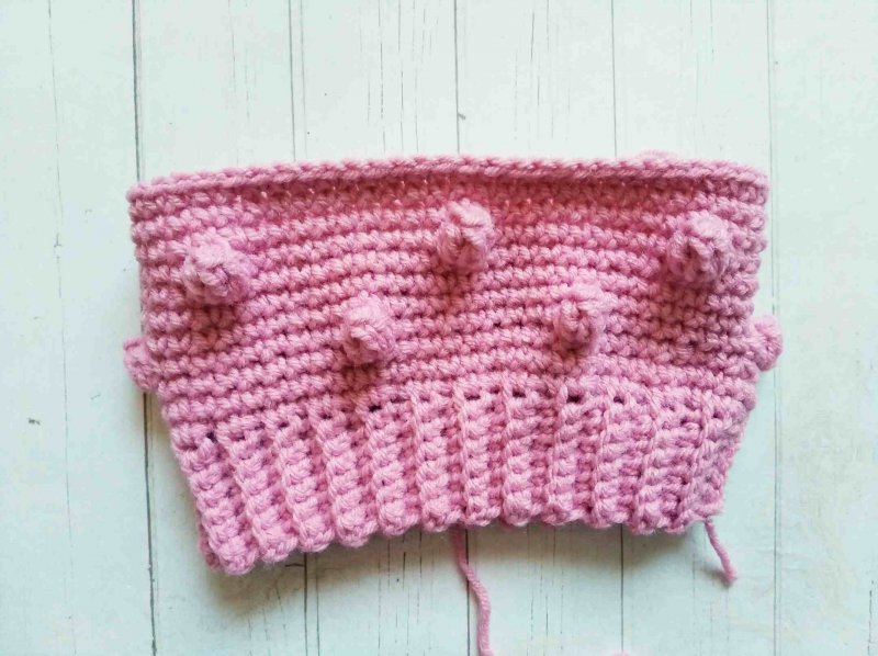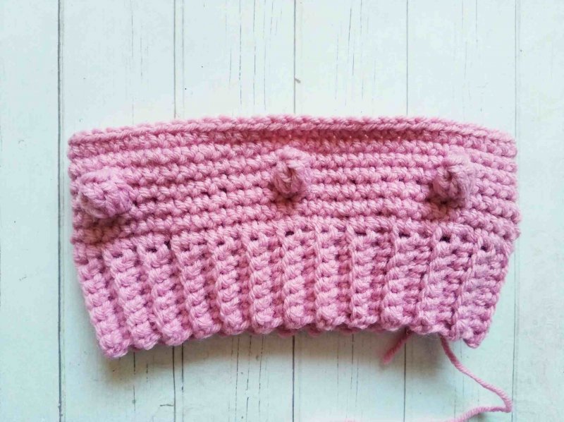 Вяжем новый ряд шишечками. Провязываем 5 С/Б/Н и вяжем шишечку. А дальше чередуем так, как в предыдущем ряду с шишечками. То есть вяжем 11 С/Б/Н и шишечка, 11 С/Б/Н и шишечка.