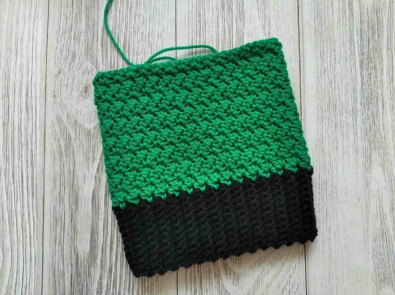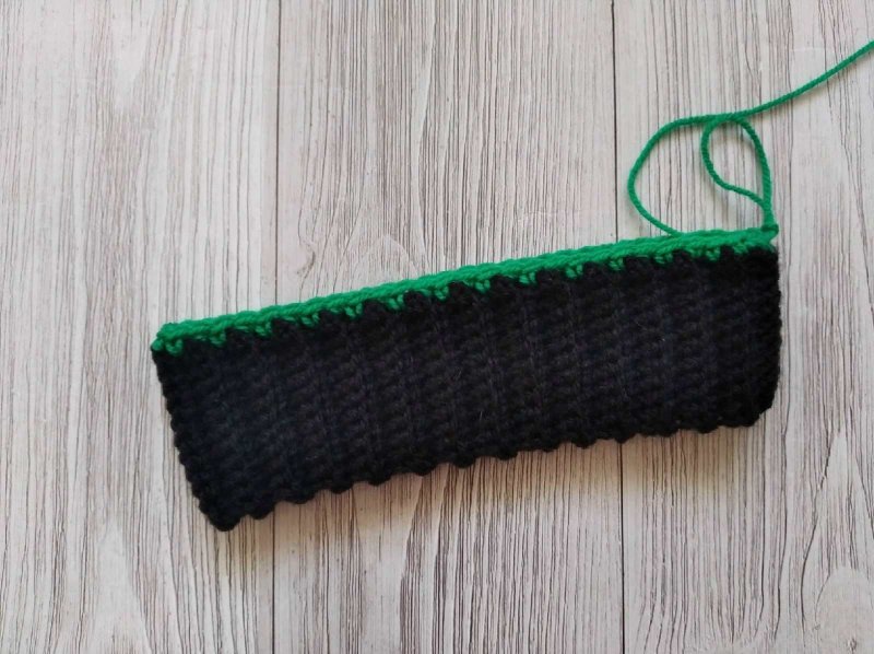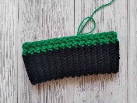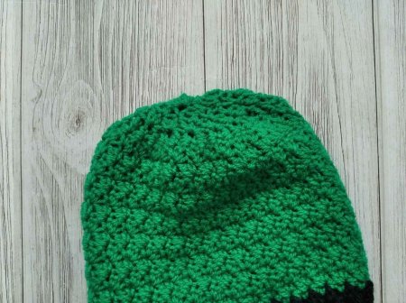 Провязываем 1 ряд Ст БН пряжей зеленого цвета. Нужно связать четное количество столбиков, чтобы начать узор шапочки. В конце выполняем С Ст.