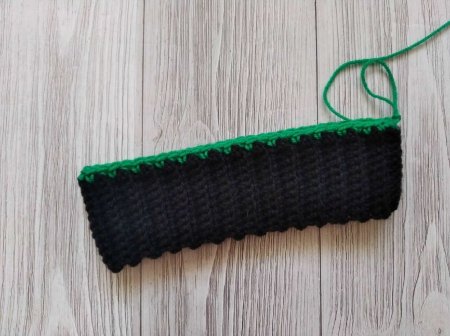 Делаем петлю подъема и поворачиваем вязание. Продолжаем вязать точно такой же ряд, как и предыдущий. И так мы будем вязать до нужной высоты шапки.