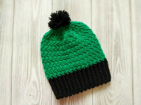 А верх шапки украшаем черным помпоном. Его можно сделать из пряжи или купить готовый.