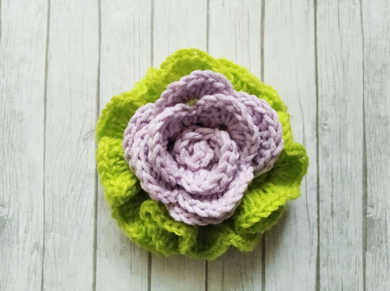 Пришиваем зеленую часть сзади к цветку. После того, как обе детали будут сшиты, нужно закрепить нить и заправить торчащие кончики внутрь вязания.