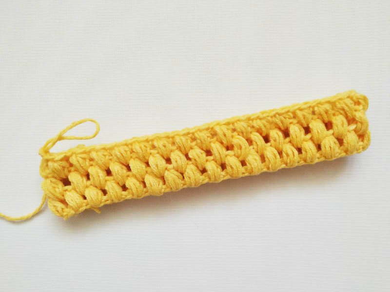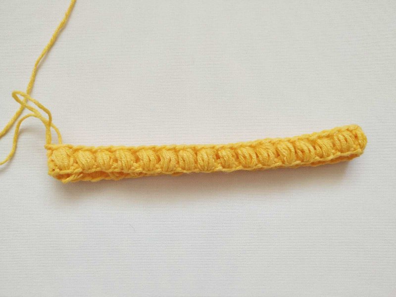 Пропускаем петлю в основании и вяжем новый пышный столбик. Так будем вязать до конца ряда. В конце его соединим.
