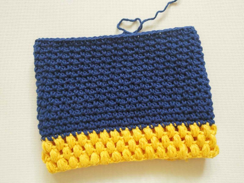 Вязать начинаем снизу вверх и вместо резинки провяжем 3 ряда пышными столбиками.