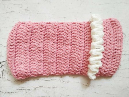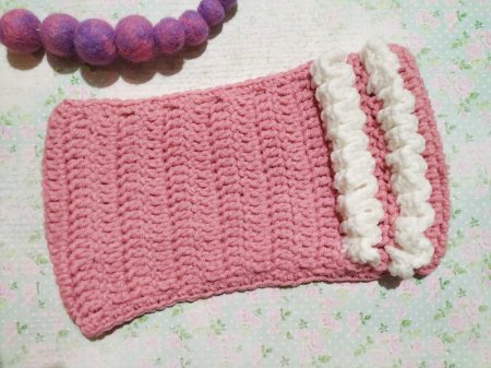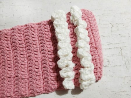 Украшать будем зигзагами белого цвета. Свяжем 2 полоски сбоку. Для этого прикрепляем нитку к стсн. Обвязываем его 3 стсн. Затем поворачиваем вязание и обвязываем 3 стсн стсн, который находится выше того, что уже обвязали. Затем опять разворачиваем полотно, потому что так удобней, и обвязываем следующий столбик 3 стсн. Так до конца.