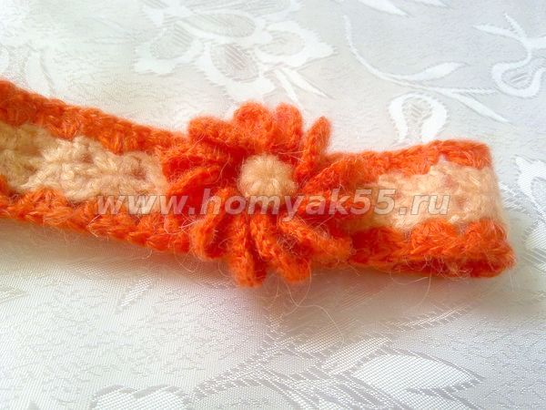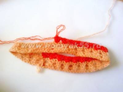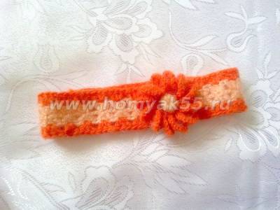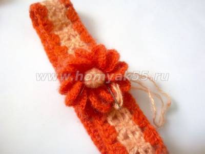Отрежьте нить, привяжите пряжу оранжевого цвета, свяжите по обе стороны повязки по одному ряду основного узора.
