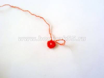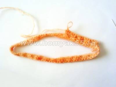 Протяните нить к основанию набранной цепочки и обвяжите другую сторону повязки основным узором.