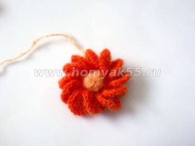 Для законченности цветка сделайте ему серединку — обвяжите колечко из цепочки (6 п) двумя рядами СБН (8 ст.). Проденьте его через центр цветка.