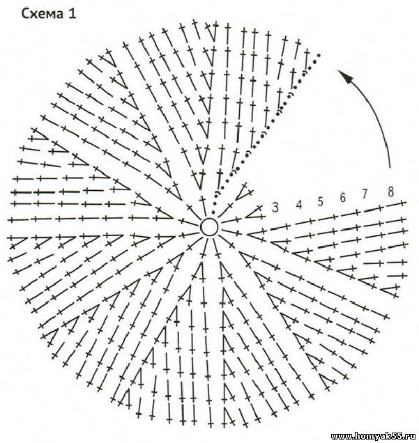 Наберите крючком №2,25 секционно окрашенной пряжей цепочку из 5 ВП, замкните её в кольцо.1 ряд: 3 ВП для подъёма, 11 ССН ввяжите в кольцо. Далее вяжите 13 рядов по схеме 1.