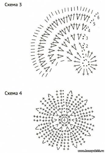 Цветок состоит из 2-х частей: основание с лепестками и отдельно связанная середина. Основу мака вяжите красной нитью по схеме 3. Крючком №1,5 зелёной нитью вяжите "завязь" по схеме 4. Готовые детали сшейте между собой мононитью, подкладывая под "завязь" синтепон. Вокруг "завязи" нашейте чёрный бисер.Журнал "Вязание модно и просто", 2012