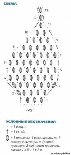 Узор с шишечками: вязать по схеме. Каждый ряд начинать с 3 ВП вместо 1-го ССН. До 6-го ряда начинать с петель до раппорта, повторять петли раппорта, заканчивать петлями после раппорта. Ряды повторять, как указано в тексте.