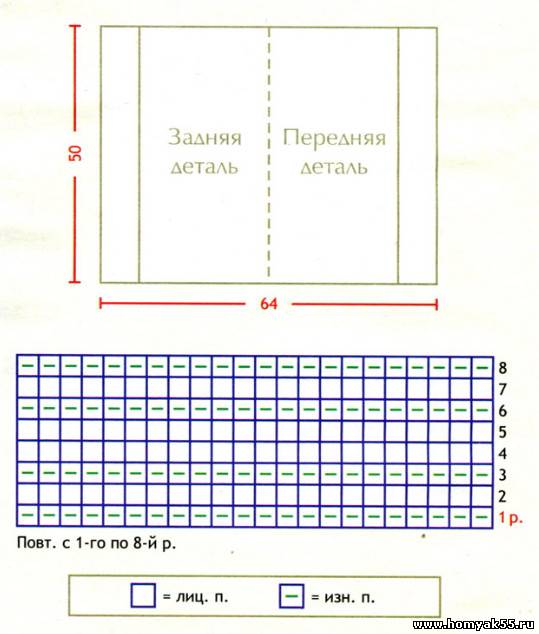 Лицевая гладь: лиц. ряды - лиц. петли, изн. ряды - изн. петли.