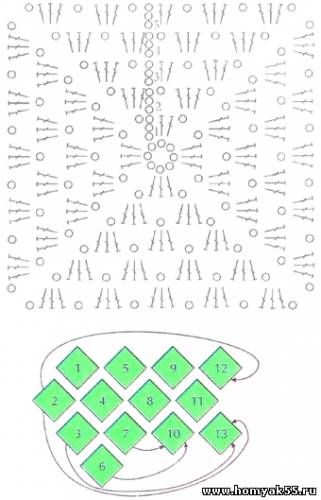Для одного квадрата связать 5 ВП и замкнуть их в кольцо с помощью СС, далее работу продолжить круговыми рядами по схеме. При этом каждый новый ряд вязать нитью нового цвета, либо выбрать последовательность чередования цвета самостоятельно.Связать 13 квадратов и соединить их в полотно сумки по схеме. Нить закрепить на одном из боковых швов и обвязать СБН, одновременно выполняя ручки сумки, провязывая цепочки из ВП желаемой длины.$CUT$ Обвязать край сумки внутри каждой ручки полустолбиками с накидом (ПСН).