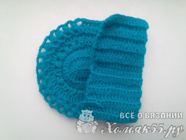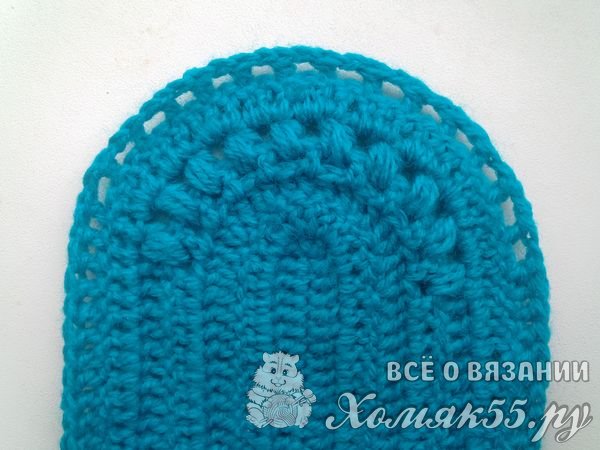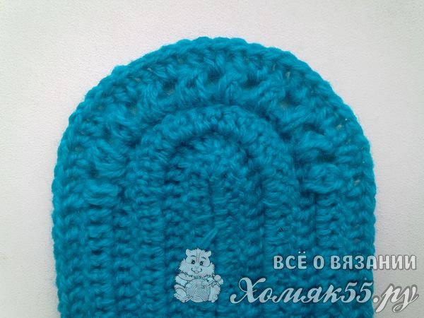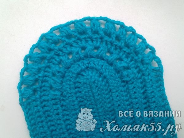 Разворачиваем вязание и вяжем 39 ССН. Делаем одну ВП и во вторую петлю основания выполняем один ССН. Снова делаем одну ВП. Всего нам нужно провязать 14 ССН во вторые петельки основания и между ними сделать по две ВП. Закончим ряд, провязав в оставшиеся петли по одному ССН.