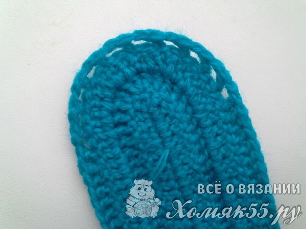 Далее вяжем по одному ССН во все петельки. Вяжем 53 ССН. Далее вяжем в одну петлю два ССН. И завершаем ряд, вывязывая по одному ССН в петлю.