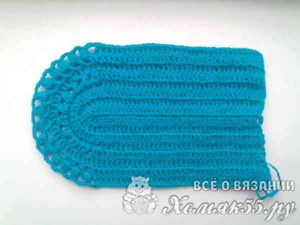 Теперь мы опять развернем вязание и провяжем 39 ССН. После этого выполняем в арочку из одной ВП один ПС из трех непровязанных ССН. Делаем две ВП. И во все остальные такие арочки выполняем по одному ПС и между ними по две ВП. Довязываем ряд 39-ю ССН.