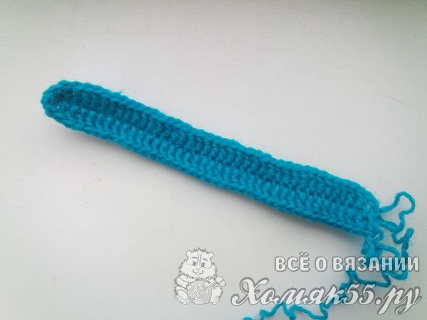 Вяжем начальную цепочку. Число ВП в ней 39. Делаем еще две ВП, заменяющие первый ССН. И далее в каждую петельку провязываем по одному ССН, кроме последней. В нее мы выполним пять ССН. И далее до конца ряда вяжем по одному ССН. То есть у нас ряд состоит из двух сторон. Провязали одну и провязываем другую.
