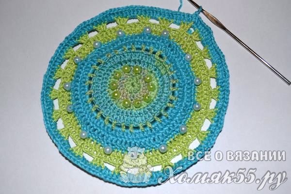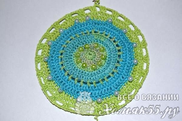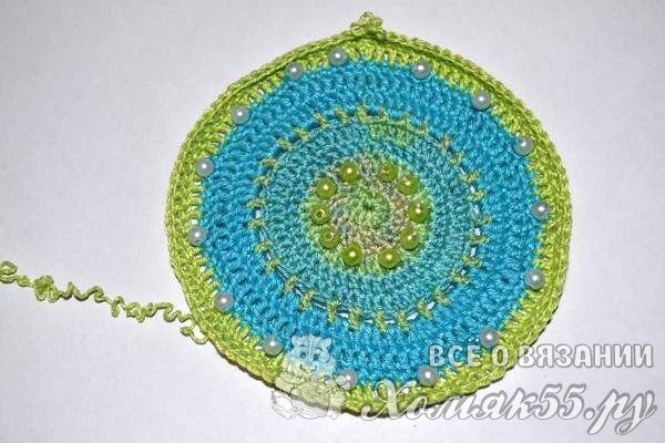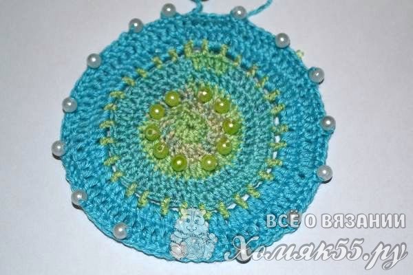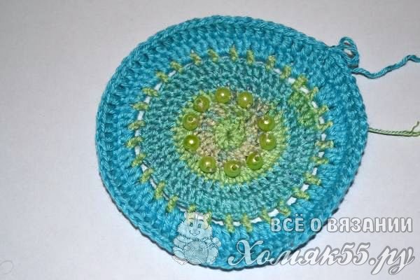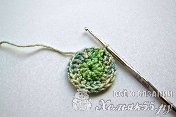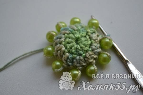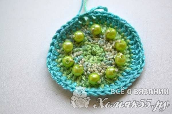 Перед вязанием на нить зеленого цвета нанизать 10 бисерин зеленого цвета, а нан нить бирюзового цвета – 15 бусин светло-голубого цвета. Набираем цепочку из четырех ВП и в четвертую от крючка петлю провязываем 10 ССН, вязание замыкаем.