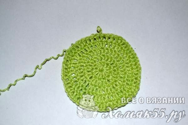 9 ряд: зеленая нить. 4 ССН, 2 ССН в одну петлю до конца ряда