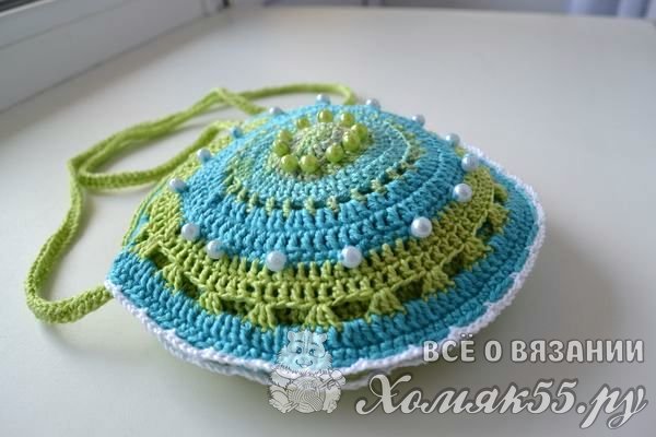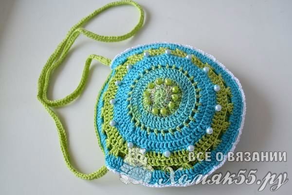Связать ручку для сумки желаемой длины из цепочки воздушных петель, а потом провязать столбики с накидами в каждую ВП. Привязать ручку к телу сумки. Сумочка готова.