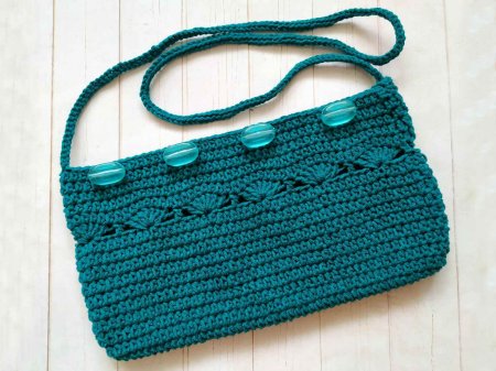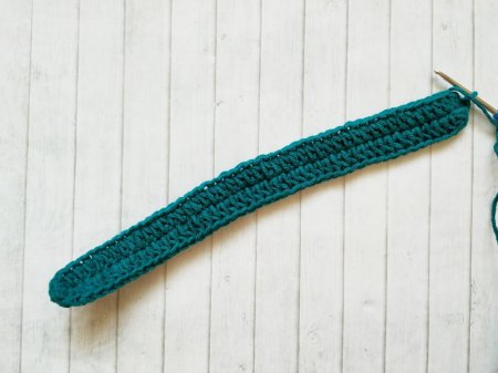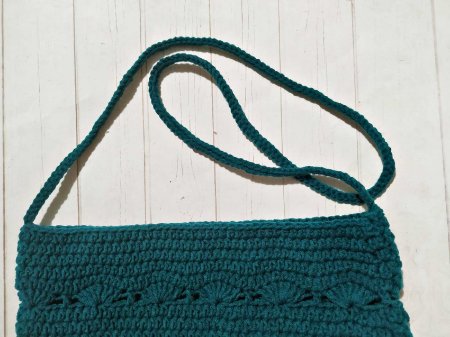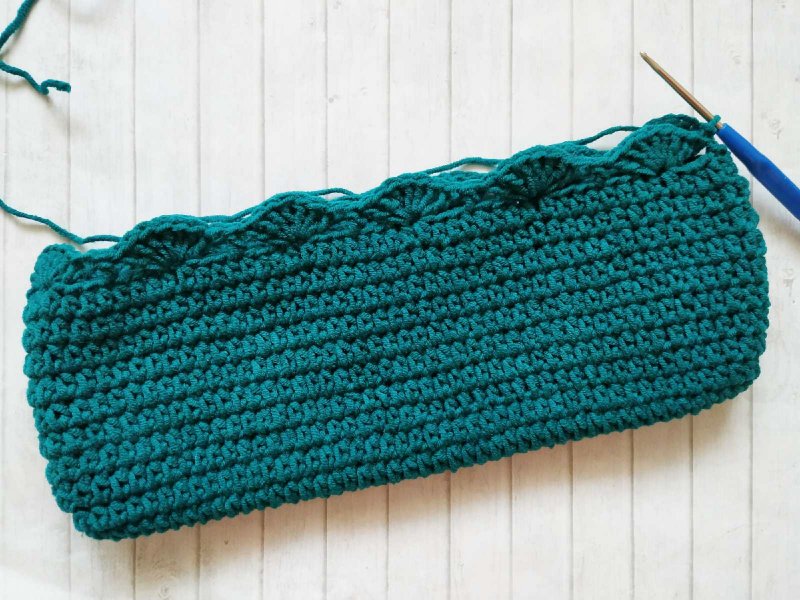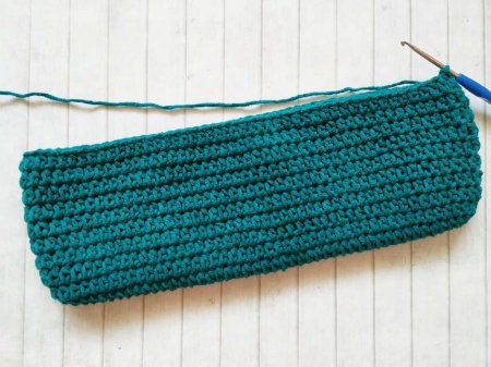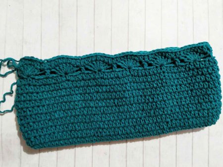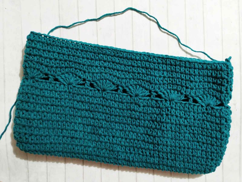 Теперь сделаем ручку. Для этого просто наберем необходимое количество петель и прикрепим с помощью 1 сст к другому уголку. Развернемся и провяжем по 1 сст по задней стороне цепочки, заводя крючок в вертикальную перемычку петли.
