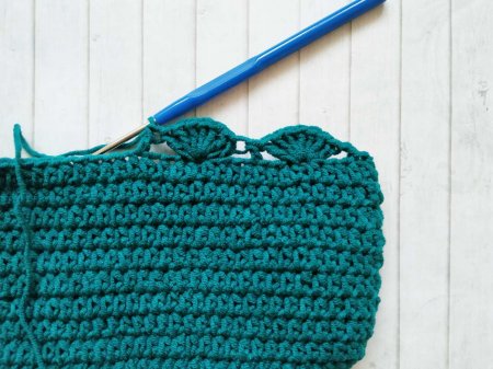 В следующем ряду начинаем с 3 петель (вместо 1 стсн). Затем пропускаем 3 петли и вяжем 7 стсн в 1 петлю. Пропускаем еще 3 петли и вяжем 1 стсн. Так повторяем весь ряд, только вместе 3 петель вяжем по 1 стсн.
