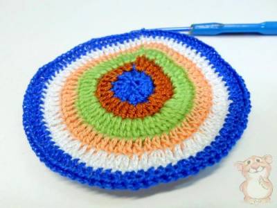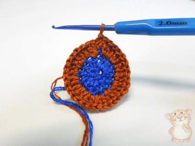 Далее снова провязываем 3 воздушных петель для подъема. Меняем цвет нитки и провязываем следующий ряд снова столбиками с накидом, но в этом ряду делаем прибавку уже не в каждую петлю, а через одну.