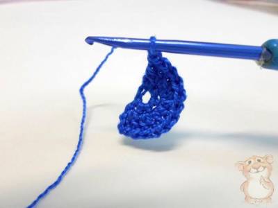 После этого начинаем вязать столбики с накидом, делая прибавку через одну петлю. Доходим до конца и поворачиваем вязание. У вас получится такой полумесяц: