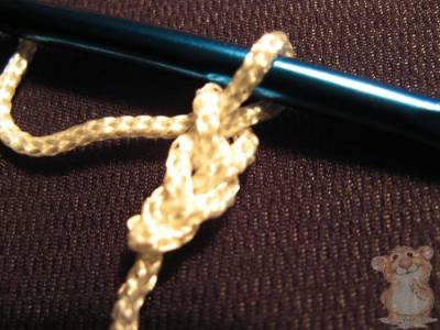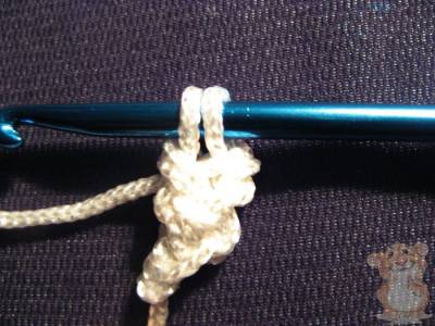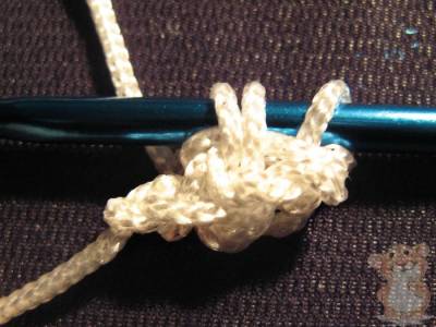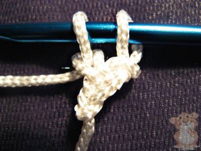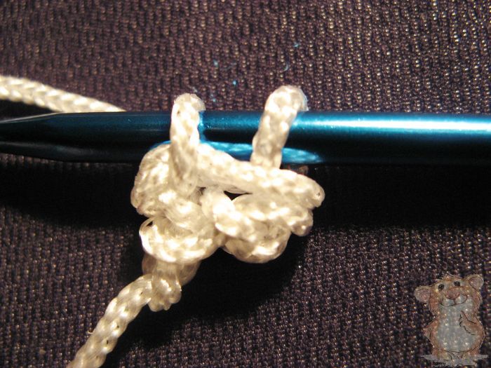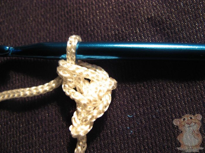 5. На крючке образовалось 2 петли, через которые снова протягиваем нить.