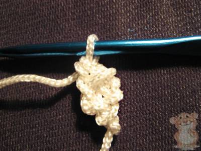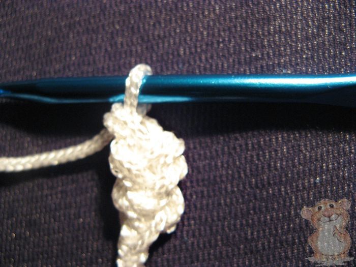 Ряд 1. Набираем белой нитью 27 + 3 ВП и делаем 1 ССН в четвёртую петлю от крючка.