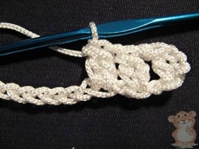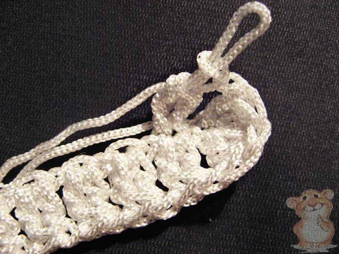6. Переворачиваем вязание по часовой стрелке и находим две параллельные ниточки, через них протягиваем нить.