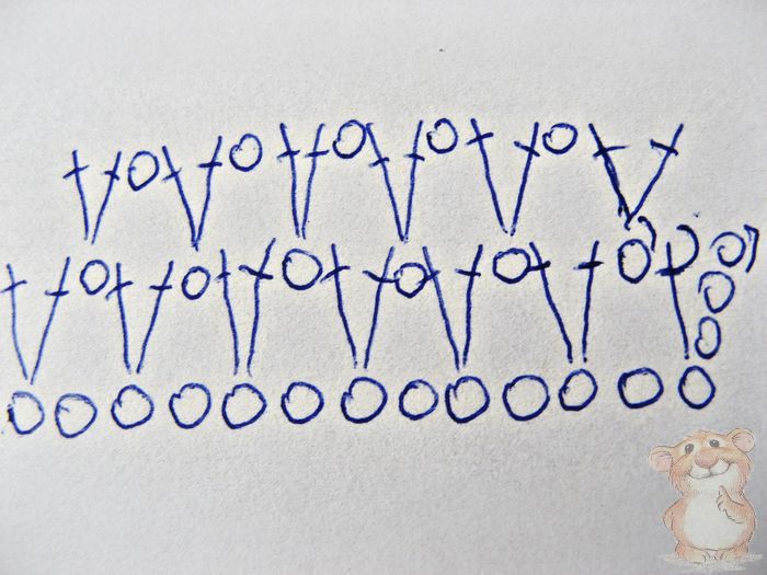 Провязываем так до конца ряда и в последнюю петлю делаем + 2 ССН с одной вершиной.