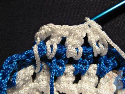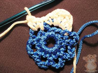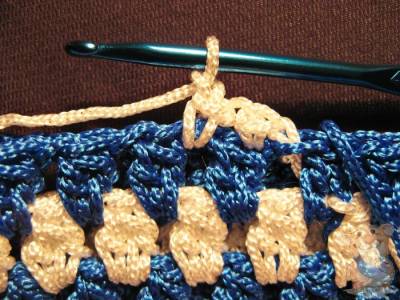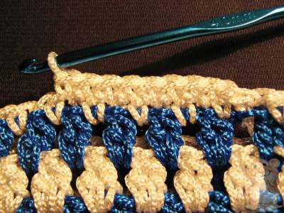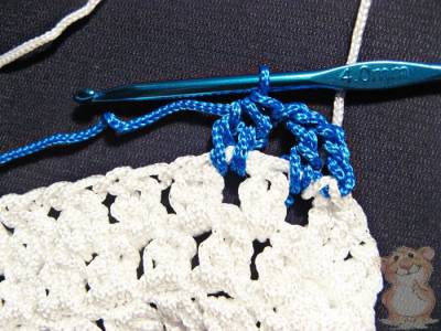 Ряд 3. Вяжем, так же как и второй ряд, но меняем цвет нити на синий.