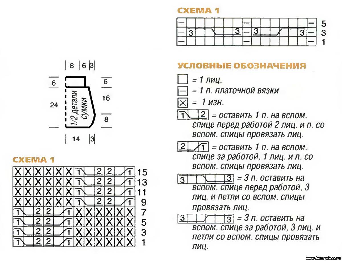 Средняя плотность вязания сумки: 16,5 петель и 20 рядов = 10 х 10 см