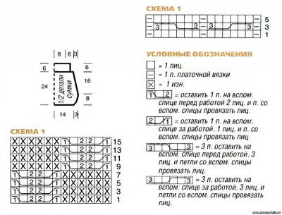 Узор с косами А шириной 12 петель: вязать по схеме 1, на которой приведены только лиц. ряды. В изн. рядах все петли вязать изн. или как указано. Повторять с 1-го по 16-й ряды.