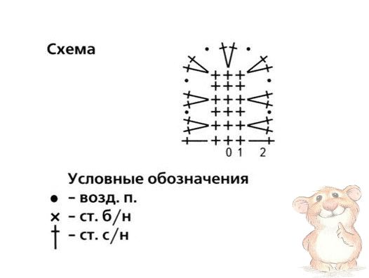 Наберите 35 ВП и вяжите вокруг цепочки 2 ряда по схеме. 3-й ряд вяжите СБН, 4, 6-й ряды - как 2-й, 5-й, 7 - 9-й - как 3-й ряд. 10-й ряд - обвяжите клапан рюкзака «рачьим шагом» коричневой нитью. В верхней части клапана выполните петельку для пуговицы. $CUT$