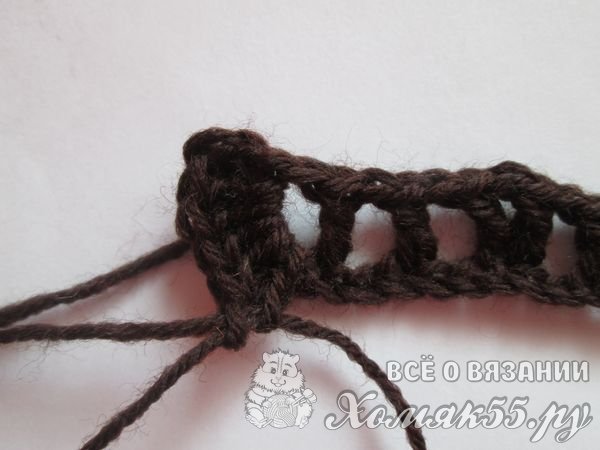 Дальше перейдем к следующему ряду. И вяжем три воздушные петли с краю и в это же место столбик с накидом. Это наша галочка.