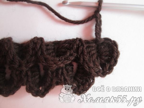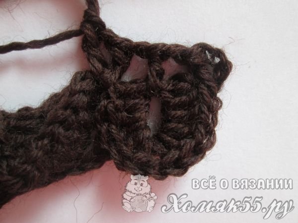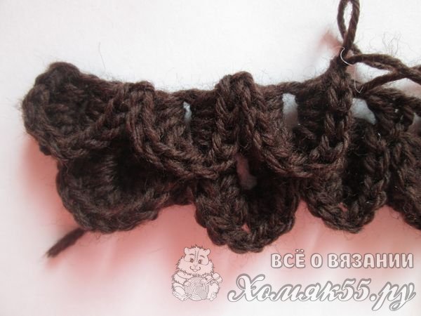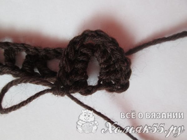 И отсюда мы делаем четыре петли. А дальше между чешуйками вяжем галочку. И так далее.