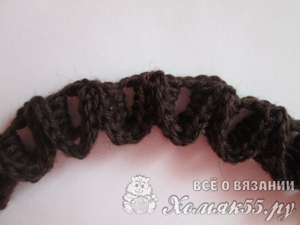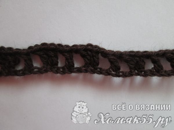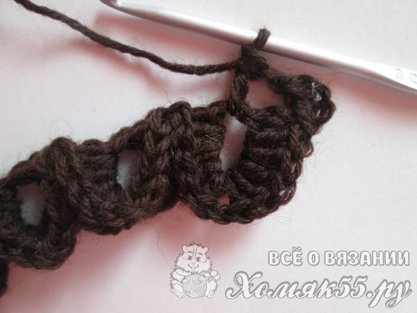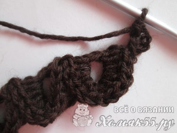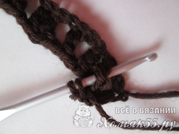 Снова делаем воздушную и отсчитываем две петли, а в третью вяжем одиночный столбик с накидом. И так дальше будем чередовать вязание до тех пор, пока не провяжем всю цепочку.