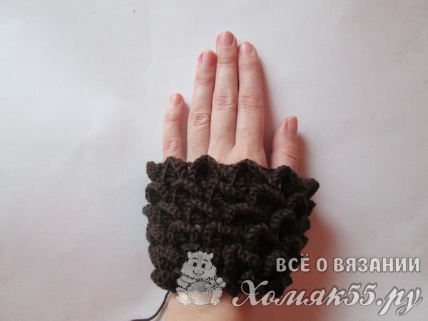 Выворачиваем и вяжем далее по кругу ряд столбиками без накида, делая убавки, примеряя к руке, чтобы отверстие было по размеру запястья.