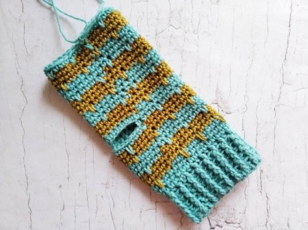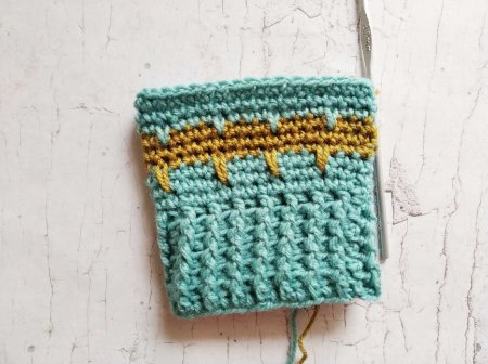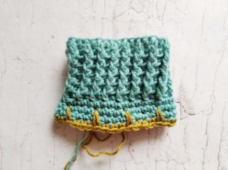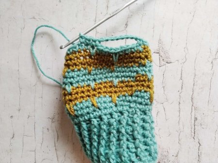 Затем чередуем цвета и вяжем аналогично все далее. То есть 1 ряд с длинными столбиками и 2 ряда обычными.