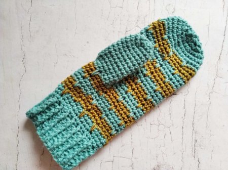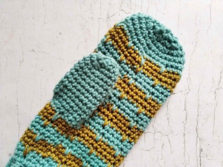 Дальше переходим к манжете, которую свяжем резинкой 1 на 1. Для этого нужно просто чередовать рельефный лицевой С/С/Н и рельефный изнаночный С/С/Н. Так мы будем вязать несколько рядов, пока не свяжем необходимой высоты манжету варежки.