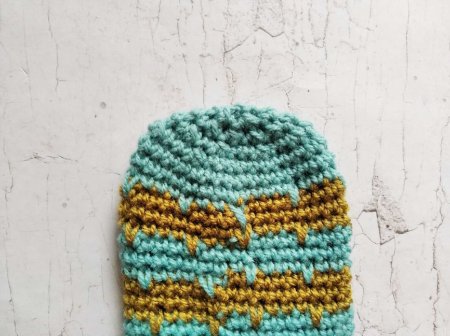 В следующем ряду вяжем 1 С/Б/Н и убавку. Так весь ряд. Последующие ряды до закрытия вяжем по 2 С/Б/Н вместе.