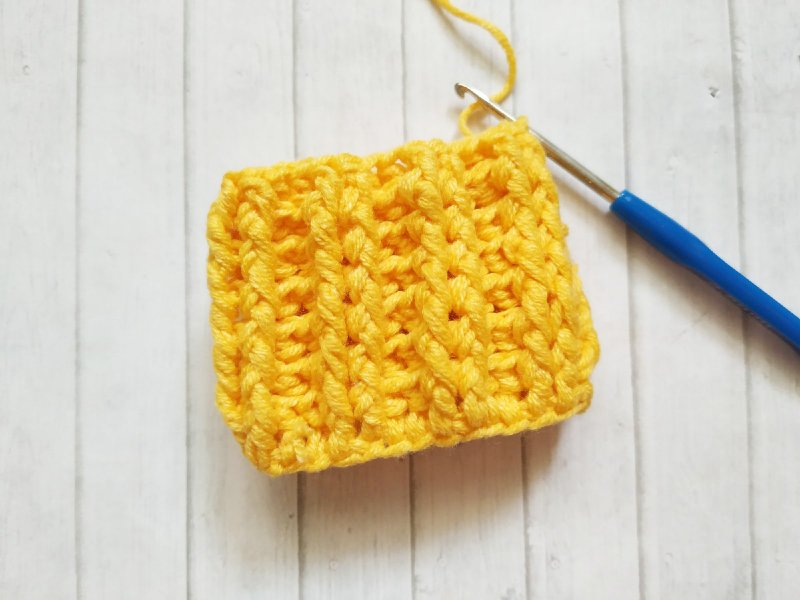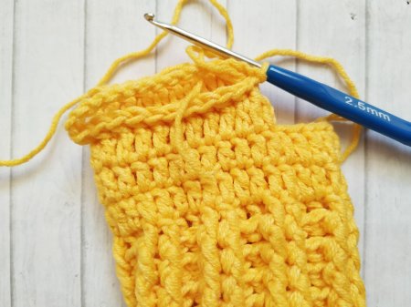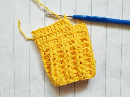 На этом этапе следует вывязать верхний кармашек, который будет открываться. Для этого нужно провязать сбн за ножки ссн предыдущего ряда. То есть, выполнить рельефные сбн на ряд ниже. А потом набрать воздушную цепочку с таким же количеством петель и замкнуть в круг.