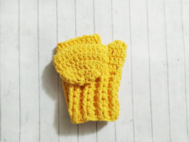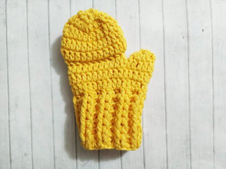 Прикрепить нить к отверстию большого пальца и провязать 2 ряда. Затем убавить через петлю и закрыть отверстие.