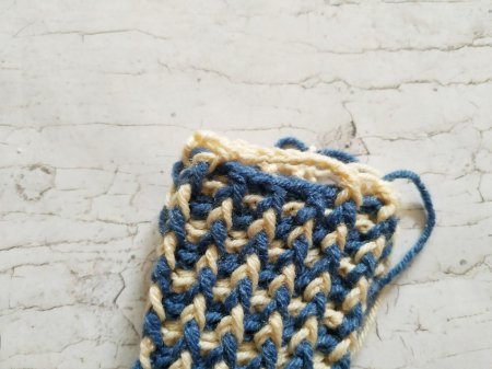 Затем меняем нить и вяжем за простой ссн 1 изнаночный рельефный ссн (далее ирссн), а за лрссн нижнего ряда провязываем такой же лрссн.